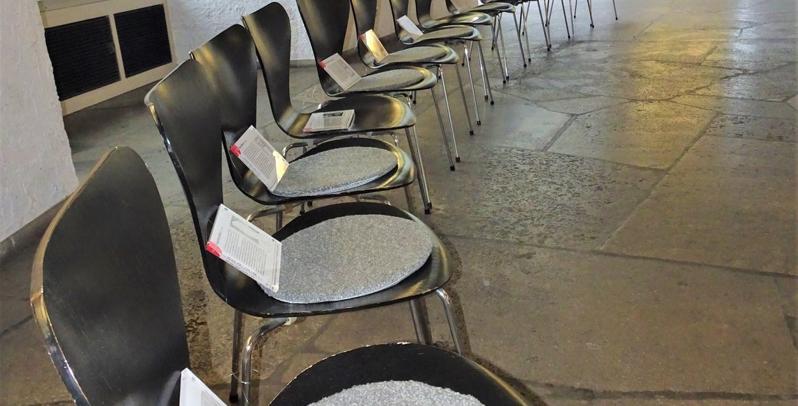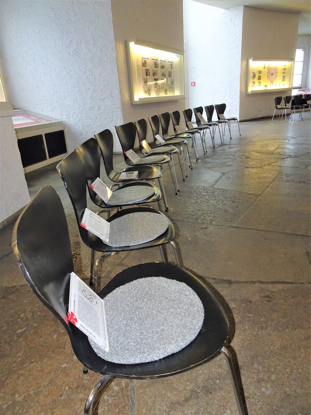 In der Wandelhalle der Paulskirche trafen die Besucherinnen und Besucher der Gedenkveranstaltung auf einen Halbkreis aus 32 Stühlen. Diese standen symbolisch für 32 Tote, deren sterbliche Überreste heute in Kriegsgräbern auf dem Frankfurter Hauptfriedhof bestattet sind. Informationstafeln auf den Stühlen dokumentierten die individuellen Schicksale dieser Menschen. Sie starben in den Weltkriegen und ihren Nachkriegszeiten oder wurden als Opfer der nationalsozialistischen Gewaltherrschaft ermordet: Soldaten und Krankenschwestern, Bombentote, Kriegsgefangene, Zwangsarbeitskräfte, KZ-Häftlinge und "Displaced Persons", aber auch das zwei Monate alte Baby einer Zwangsarbeiterin. Zwei der Toten, deutsche Soldaten des Ersten Weltkriegs, ruhen auf dem jüdischen Friedhof Rat-Beil-Straße, der dem Frankfurter Hauptfriedhof benachbart ist.