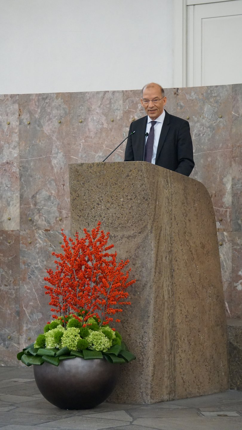 In seiner Begrüßung betonte Stadtkämmerer Dr. Bastian Bergerhoff, dass die Paulskirche ein besonders würdiger Rahmen für die Gedenkstunde sei. „Kein anderer Ort in Frankfurt steht mehr für Demokratie, Menschenrechte und Frieden“, sagte er. Neben der Erinnerung an die Opfer früherer Kriege sei es wichtig, auch diejenigen im Blick zu haben, die sich auf der Flucht vor aktuellen gewaltsamen Auseinandersetzungen befinden.