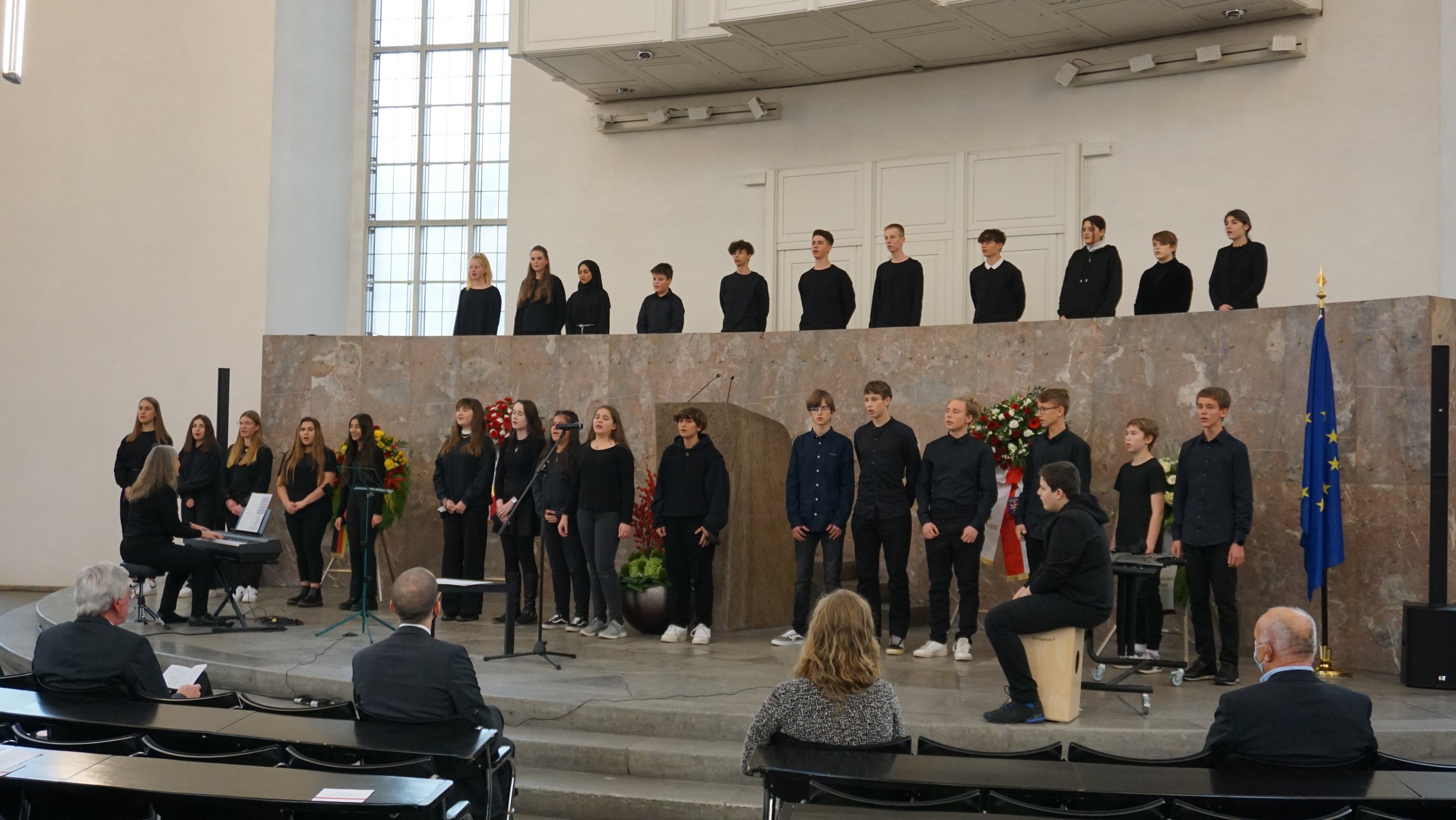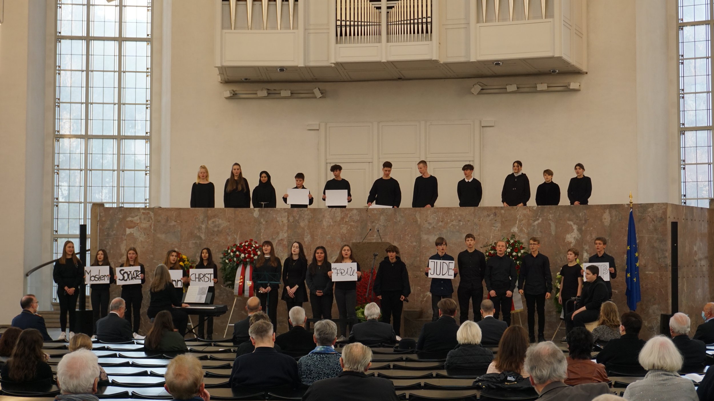 Mit ihren selbst verfassten Gedichten und Kurzgeschichten erinnerten die Schülerinnen und Schüler der Goetheschule in Dieburg an die Schrecken und die Folgen von Krieg und Gewaltherrschaft – in Vergangenheit und Gegenwart. Sie stellten selbstkritisch und warnend fest: „Heutzutage nehmen wir das alles für selbstverständlich. Aber wenn wir nicht aufpassen, ist Frieden vergänglich. Pandemien, Klimawandel, Kriege, wir haben Probleme und zwar viel zu viele.“ Gleichzeitig teilten die Jugendlichen ihre ganz persönlichen Wünsche und Visionen für eine Zukunft ohne Krieg und Gewalt: „Kriege müssen beendet werden, dass wir uns wichtigeren Dingen zuwenden. Keine Leben grundlos beenden. Solidarität, weltweites Leben als Einheit, das ist der einzige Weg zur wahren Freiheit!“ Die von den Jugendlichen ausgewählten Liedbeiträge „Imagine“ und „Was keiner wagt“ setzten, nicht zuletzt durch den emotionalen Vortrag des Schulchors Melody, zusätzliche Akzente und waren Teil der gemeinsamen Botschaft zum diesjährigen Volkstrauertag.