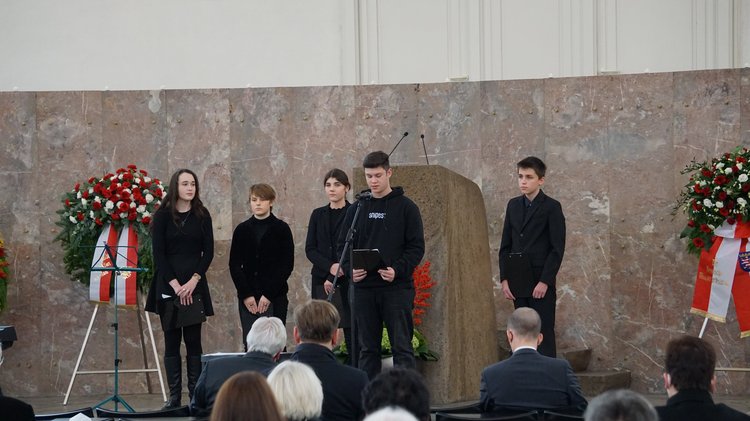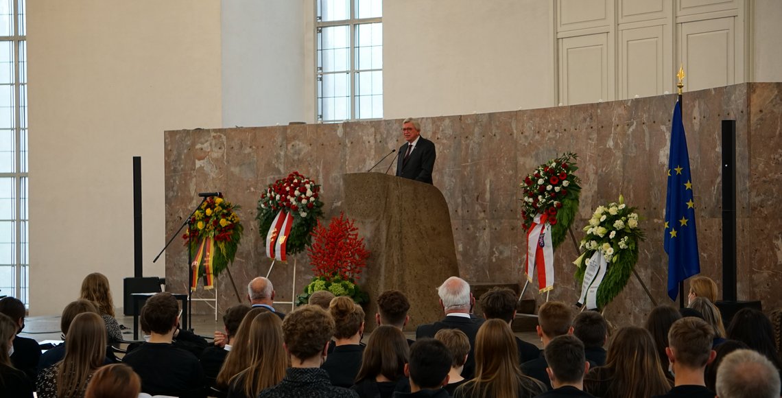 In seiner Gedenkrede reagierte Ministerpräsident Volker Bouffier auf den Impuls der Jugendlichen und führte aus, dass es zu den großen Errungenschaften gehört, „dass wir heute sagen können: Wir leben in einem friedlichen und geeinten Europa. Das war und ist keine Selbstverständlichkeit, daran müssen wir jeden Tag immer wieder aufs Neue und entschlossen arbeiten. Wir erleben noch immer, dass rechtsextremes Gedankengut in unserem Land auf fruchtbaren Boden trifft. In Hessen und in Deutschland darf es aber keinerlei Platz für Rassismus und Antisemitismus, für Hass und Hetze geben – dafür werden wir auch künftig mit allen Mitteln des Rechtsstaats eintreten und wir werden Haltung zeigen: gegen Rechtsextremismus und für eine starke Demokratie.“