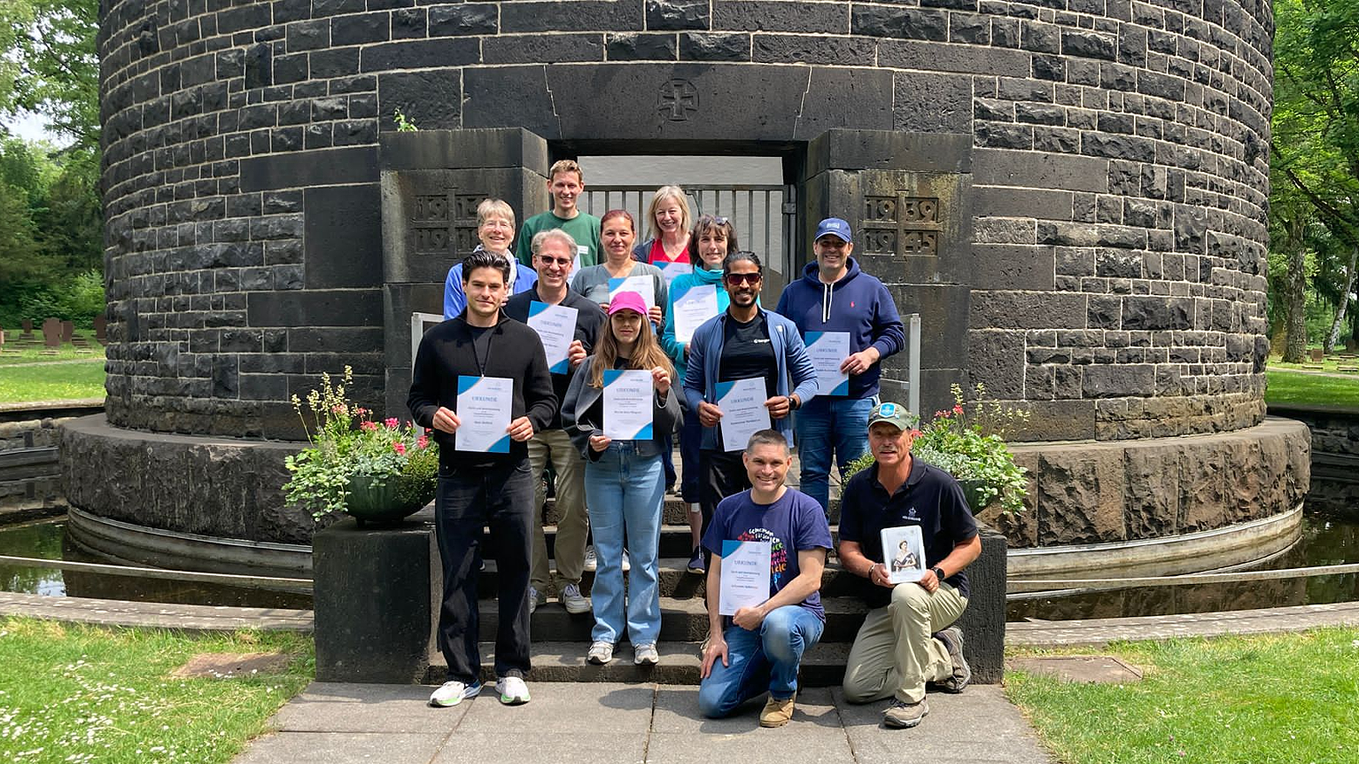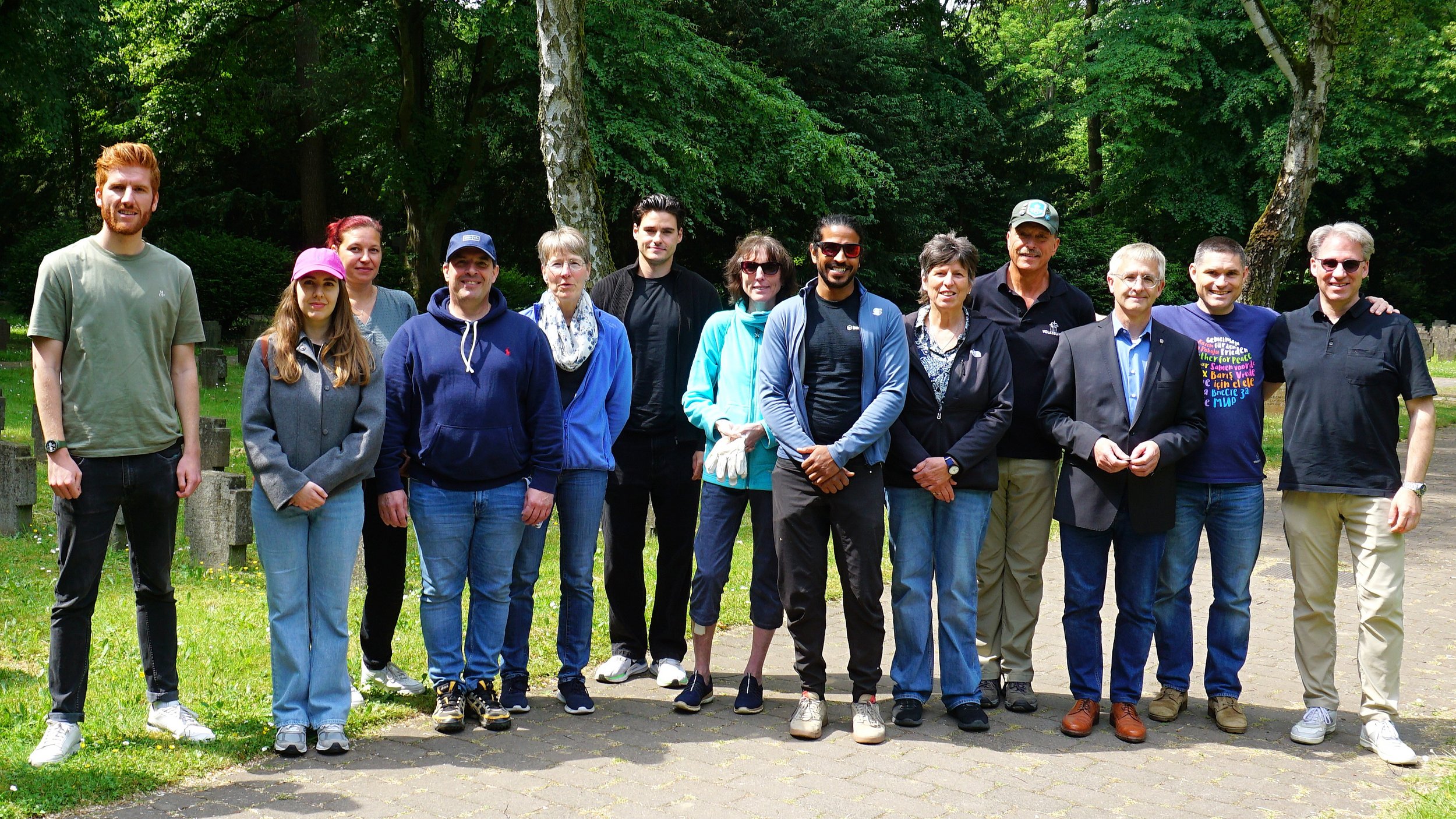 Die zehnköpfige Gruppe um Johannes Heilmeier, die am 21. Mai 2025 ihre Büros in London und Frankfurt mit den Kriegsgräberfeldern des Frankfurter Hauptfriedhofs vertauschte, kam erneut mit einem klaren Ziel: Wege, Mauerfugen und Grabsteine zu reinigen, um die Leitgedanken der Volksbundarbeit – wie 2023 schon einmal – mit einem eigenen Beitrag zu würdigen. Tore May und Petra Tursky-Hartmann vom Landesvorstand des Volksbunds in Hessen begrüßten die Gruppe und dankten allen Beteiligten herzlich für ihr Engagement, das neben der körperlichen Arbeit auch eine größere Geldspende einschloss.