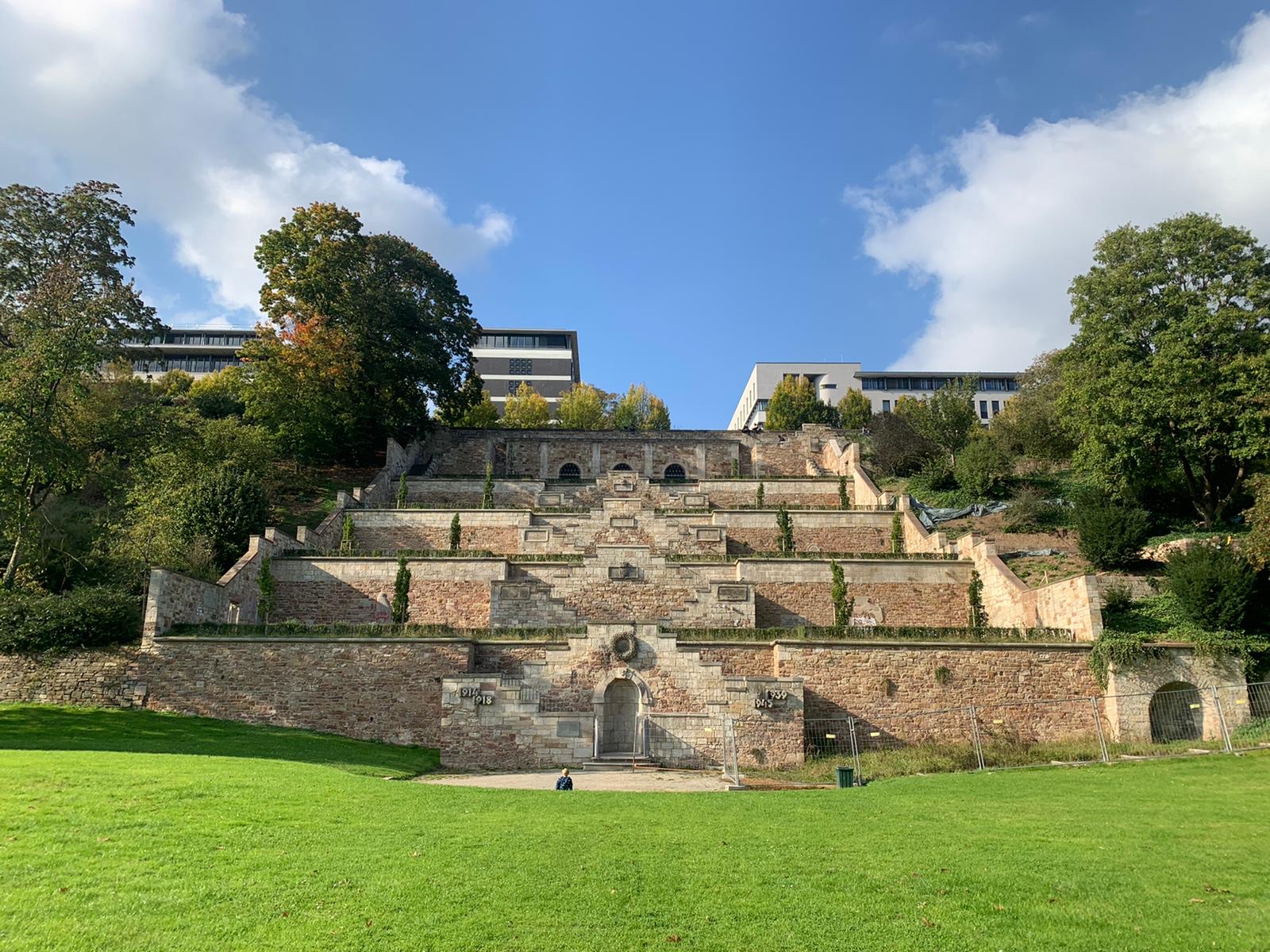 Die Hessen Kassel Heritage (vormals Museumslandschaft Hessen Kassel), zu deren Liegenschaften das Mahnmal gehört, hat den Volksbund um seine Expertise und die Übernahme von Bildungsarbeit vor Ort gebeten. Und tatsächlich passen die Themen, die die enorme Terrassenanlage zu bieten hat, hervorragend zu den Anliegen des Volksbunds.