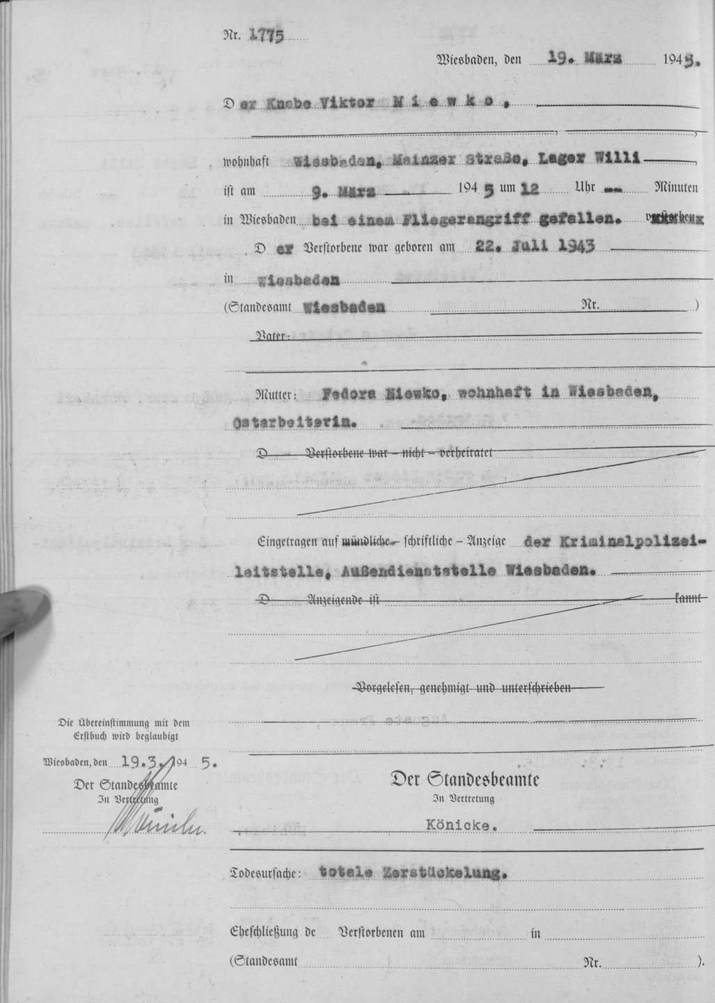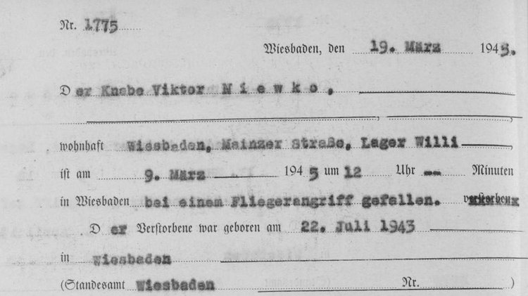 Die Schreibung des Familiennamens von Viktor „Niewko“ und seiner Mutter zum Beispiel ist in dieser Form nicht nur auf seinem Grab zu finden, sondern bereits im Wiesbadener Sterberegister belegt, wo am 19. März 1945 der Tod des Kindes eingetragen wurde, sowie in Dokumenten der Nachkriegszeit, die auf diese amtliche Quelle zurückgehen.