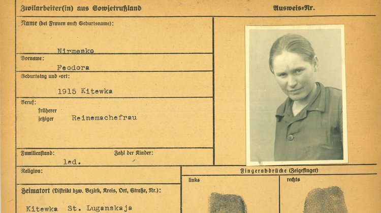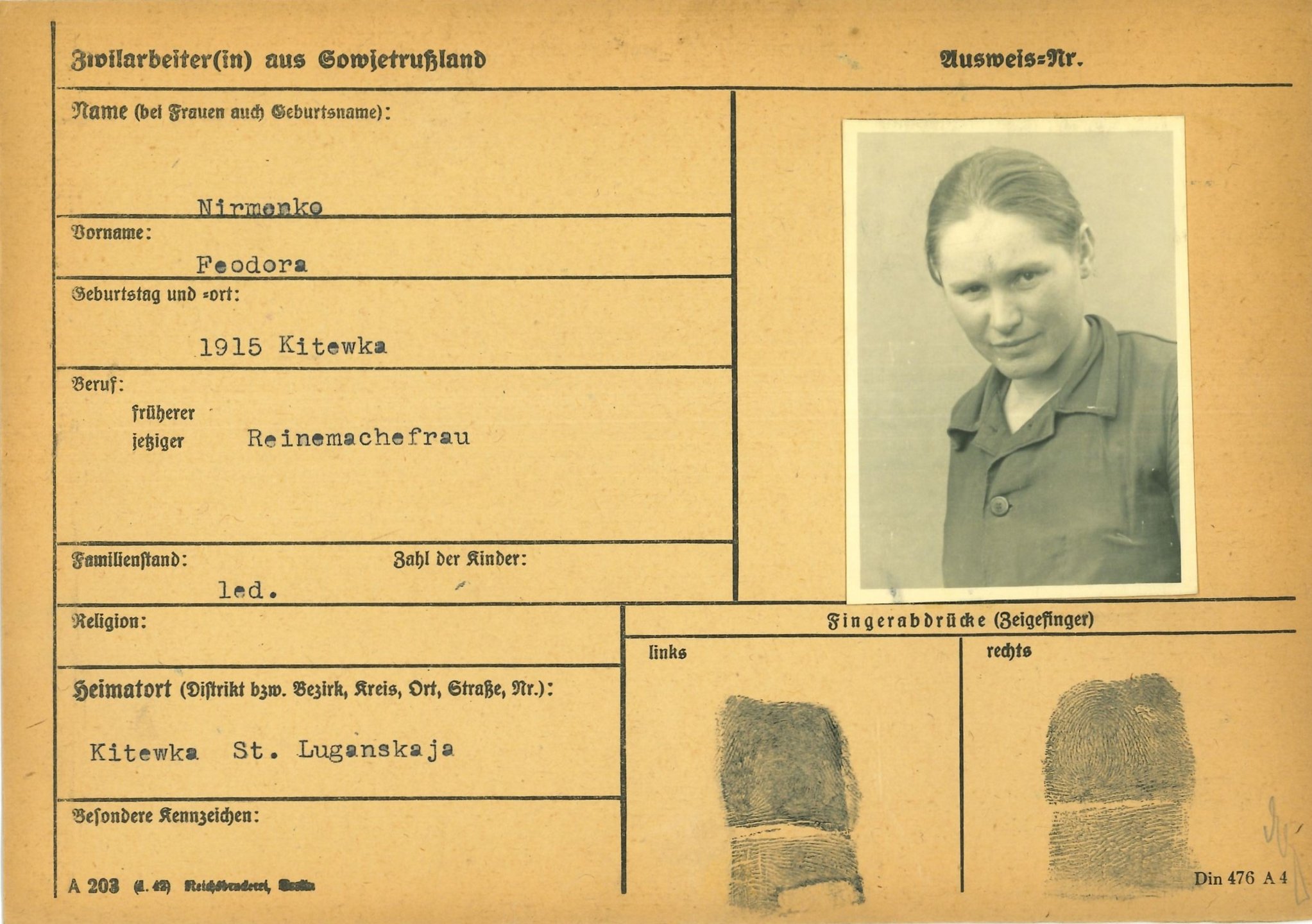 Kennkarte für Feodora „Nirmenko“, angelegt am 5. Februar 1943 (StadtA WI, Best. K3). Die Karte mit Fingerabdrücken und Passfoto stammt aus der „Ostarbeiterkartei“ der Ausländerbehörde des Wiesbadener Polizeipräsidiums, in der im Zweiten Weltkrieg die in der Stadt eingesetzten Zwangsarbeiterinnen und Zwangsarbeiter aus Polen und der Sowjetunion erfasst wurden. Auch „Nirmenko“ ist nicht die richtige Schreibung des Familiennamens, der tatsächlich Iremenko, Jiremenko, Irjomenko oder Jerjomenko gelautet haben könnte. © Stadtarchiv Wiesbaden