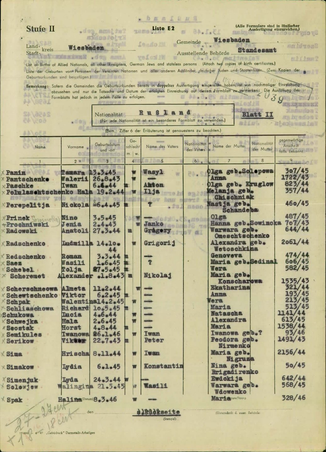 Standesamt Wiesbaden, Formblatt gemäß USFET-Befehl vom 8. Januar 1946, Liste der Geburten von Personen der Vereinten Nationen und aller anderen Ausländer, deutscher Juden und Staatenlosen (seit 1939), hier: Nationalität „Rußland“, 1947. Im Vorschaufenster ganz unten: Viktor Serikow, geb. 22.07.1943. Bestände der Arolsen Archives (DocID: 85951875). © Arolsen Archives