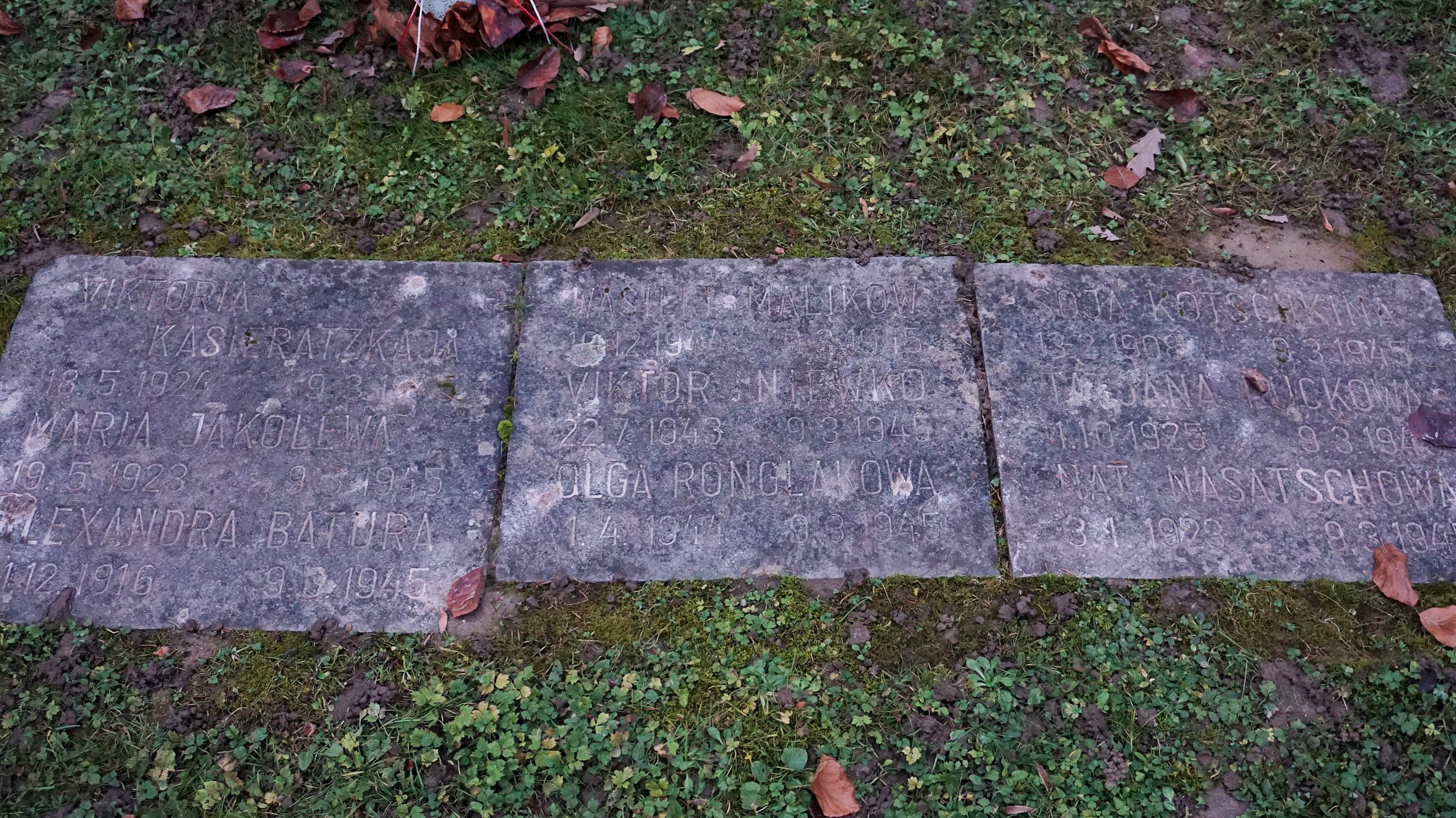 Drei dicht nebeneinander verlegte Steinplatten im Gräberfeld der ausländischen Kriegstoten im Friedhofsabteil C 1 kennzeichnen die Sammelgrabstätte von neun Menschen – sechs Zwangsarbeiterinnen aus der Sowjetunion und drei Kindern –, die am 9. März 1945 bei einem Luftangriff auf Wiesbaden getötet wurden. Die beiden Jungen und ein Mädchen im Säuglings- und Kleinkindalter – Wasilij Malikow, Viktor Niewko und Olga Ronglakowa, so die Schreibweisen ihrer Namen auf dem Grab – waren nicht die Kinder der erwachsenen Frauen, mit denen sie zusammen bestattet wurden, doch waren ihre Mütter ebenfalls Zwangsarbeiterinnen aus der Sowjetunion. Alle drei Kinder waren in Wiesbaden geboren.