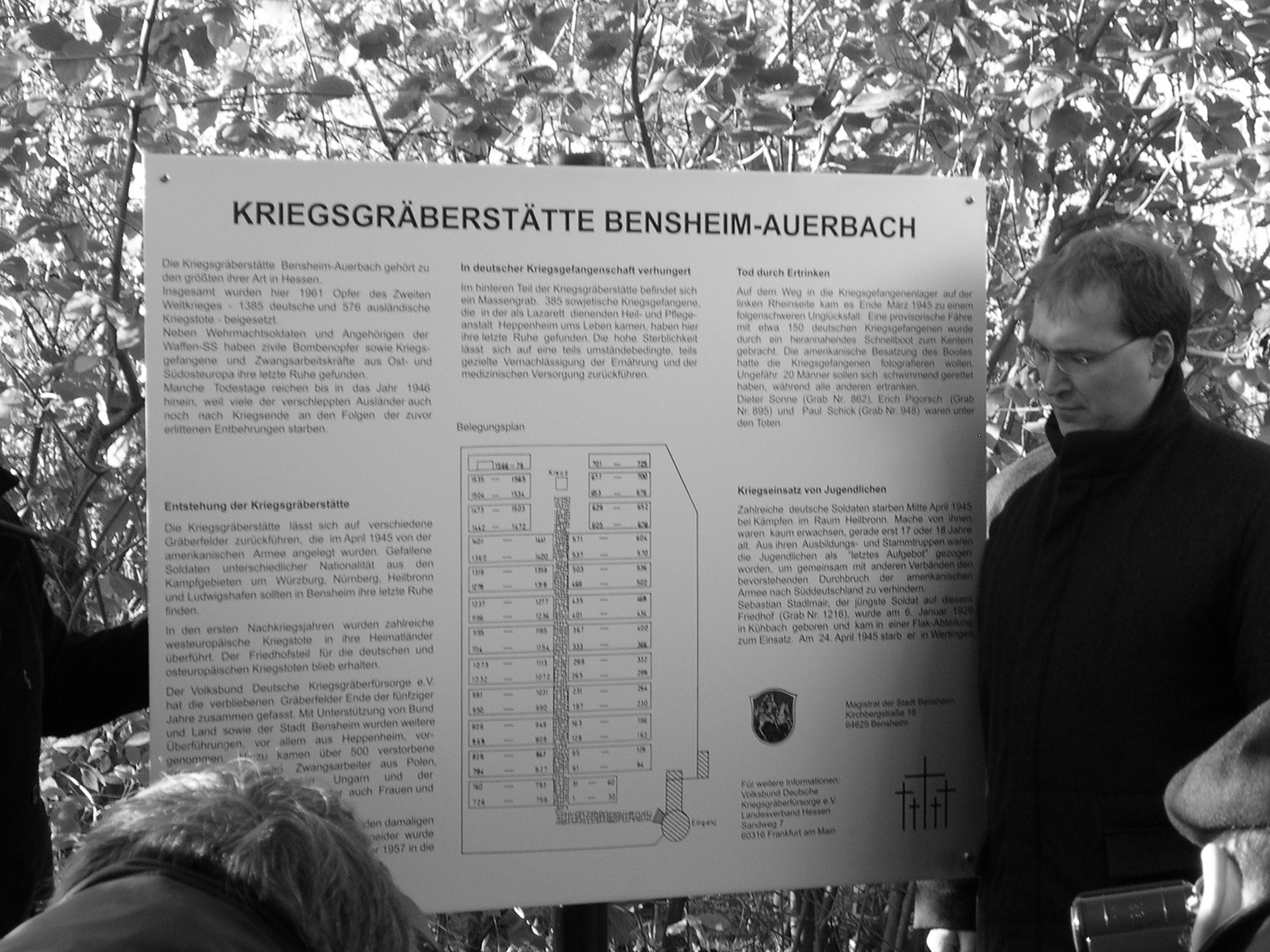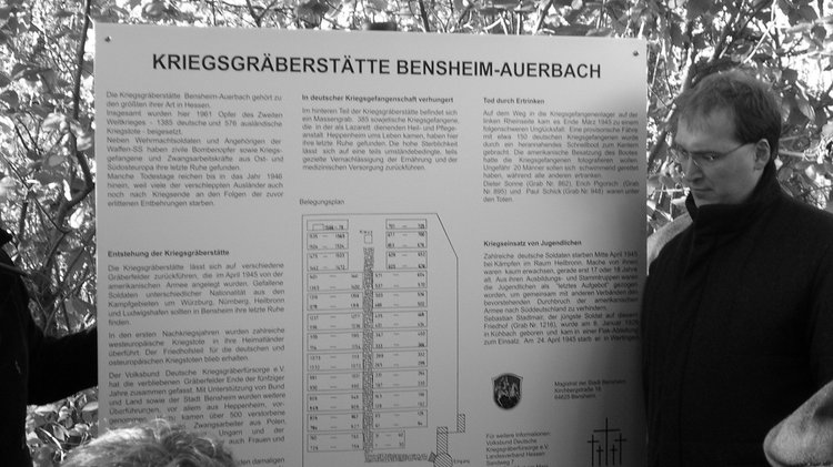 Zahlreiche der hier bestatteten deutschen Soldaten starben Mitte April 1945 bei den Kämpfen im Raum Heilbronn. Manche von ihnen waren kaum erwachsen, gerade erst 17 oder 18 Jahre alt. Aus ihren Ausbildungs- und Stammtruppen waren die Jugendlichen als »letztes Aufgebot« gezogen worden, um gemeinsam mit anderen Verbänden den bevorstehenden Durchbruch der amerikanischen Armee nach Süddeutschland zu verhindern. Auch nach Ende der Kämpfe erwartete viele Soldaten zunächst ein ungewisses Schicksal. Auf dem Weg in die Kriegsgefangenenlager auf der linken Rheinseite kam es Ende März 1945 zu einem folgenschweren Unglücksfall: Eine provisorische Fähre mit etwa 150 deutschen Kriegsgefangenen wurde durch ein herannahendes Schnellboot aus Versehen zum Kentern gebracht. Ungefähr 20 Männer sollen sich schwimmend gerettet haben – während alle anderen ertranken. Einige der Opfer sind auf der Bensheimer Kriegsgräberstätte begraben.