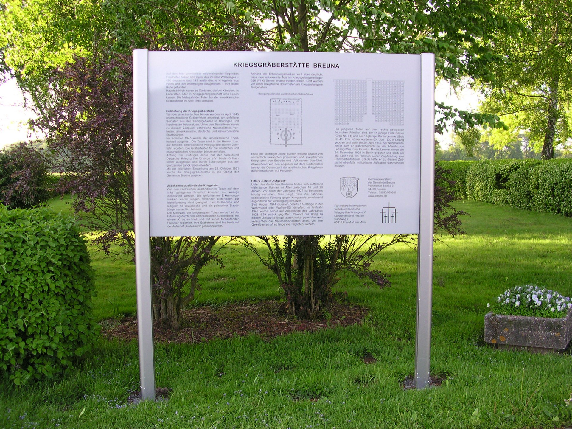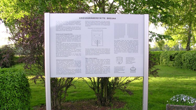 Etwas außerhalb der Gemeinde Breuna liegen zwei Kriegsgräberstätten. Getrennt voneinander wurden hier 490 deutsche und 145 ausländische Kriegstote aus Polen und der Sowjetunion beigesetzt. Hauptsächlich waren es Soldaten, die bei Kämpfen, in Lazaretten oder in Kriegsgefangenschaft gestorben sind. Anfang der 1950er Jahre baute der Volksbund die ursprünglich vom amerikanischen Gräberdienst angelegten Gräberfelder mit Hilfe von Pfadfindergruppen aus. 1951 wurden beide Kriegsgräberstätten eingeweiht und in die Obhut der Gemeinde Breuna gegeben.