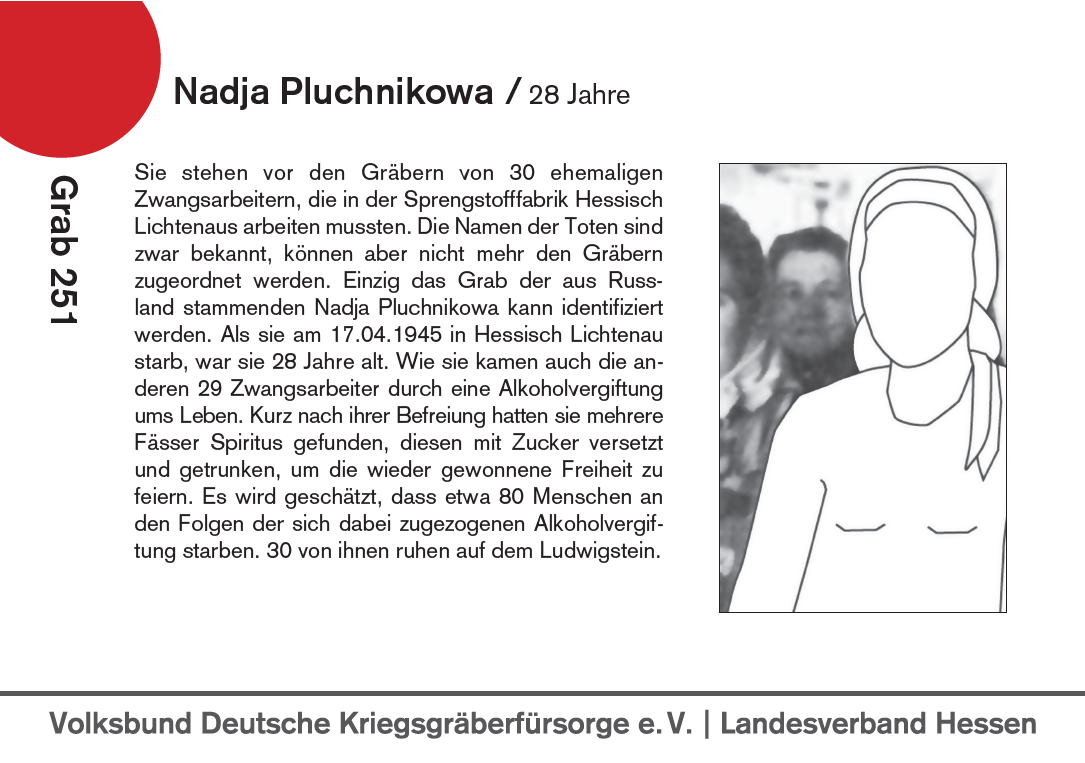 In der zweiten Arbeitsphase des Projekts wurden die Schicksale von neun Menschen – acht Männern und einer Frau –, die exemplarisch für die in Ludwigstein bestatteten Gruppen von Toten stehen, aus den verfügbaren Quellen rekonstruiert. Die Ergebnisse werden seit 2009 auf Einzelschicksalstafeln an den jeweiligen Gräbern präsentiert. Nach einer notwendig gewordenen Sanierung wurden die Tafeln an den Gräbern im Jahr 2015 neu aufgestellt.
