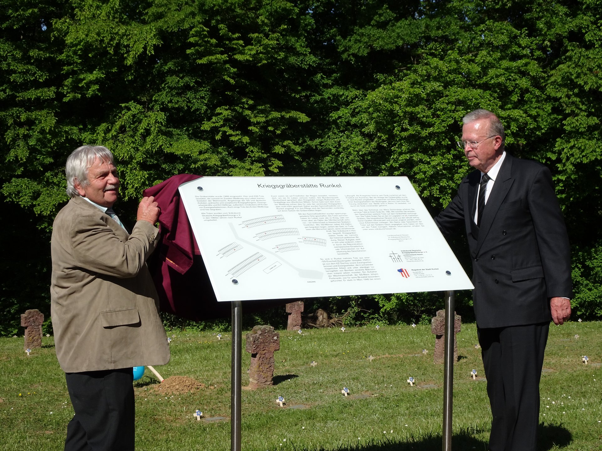 Die Forschungen des Volksbunds in Hessen zur Kriegsgräberstätte Runkel verteilten sich auf mehrere Arbeitsphasen. In der ersten Phase des Projekts wurden wesentliche Fakten der Recherche auf einer Informationstafel dokumentiert. Die Tafel wurde 2004 im Rahmen einer Gedenkveranstaltung der Internationalen Jugendbegegnung der Öffentlichkeit übergeben. Das untenstehende Bild zeigt die Enthüllung der Tafel durch den Bürgermeister und die Landesgeschäftsführerin.