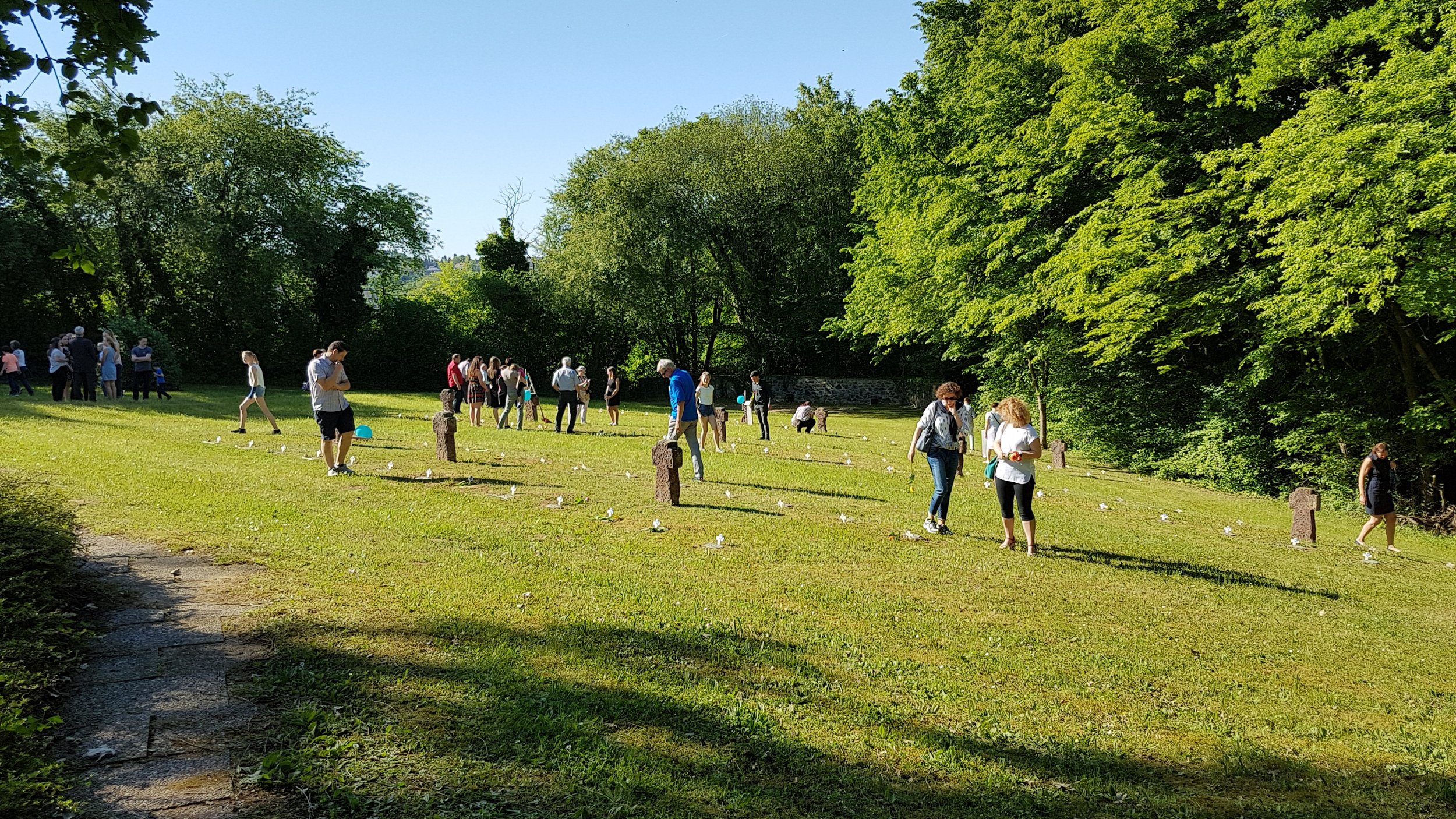 Die Gräberstätte wurde 1968 eingeweiht. Hier sind 239 Tote bestattet, die zumeist im Zweiten Weltkrieg ums Leben kamen: Soldaten der Wehrmacht, Angehörige der SS und deutsche Zivilisten, polnische und sowjetische Kriegsgefangene, Zwangsarbeitskräfte und KZ-Häftlinge, außerdem mindestens elf Kinder von Zwangsarbeiterinnen. Auch einige Tote des Ersten Weltkriegs sind hier begraben.