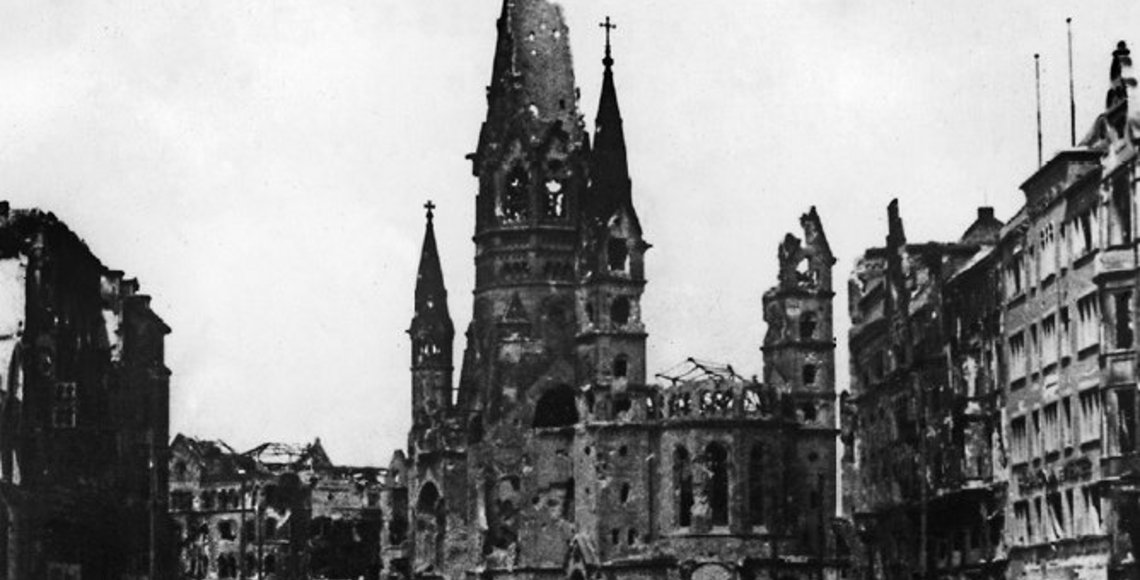 Titelbild (Ausschnitt) der Handreichung zum Volkstrauertag 2023, herausgegeben vom Volksbund Deutsche Kriegsgräberfürsorge e. V. Zu sehen ist die zerstörte Kaiser-Wilhelm-Gedächtnis-Kirche in Berlin. Volksbund